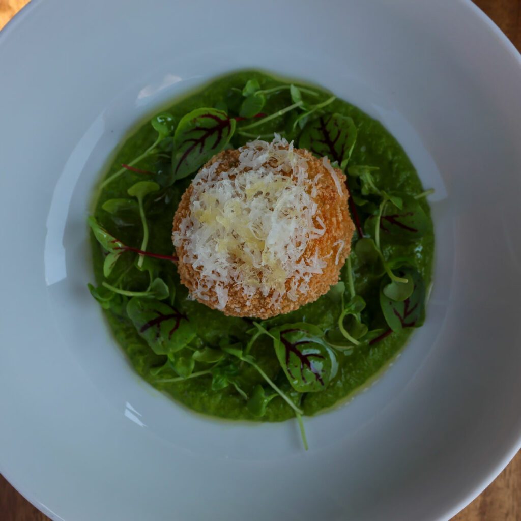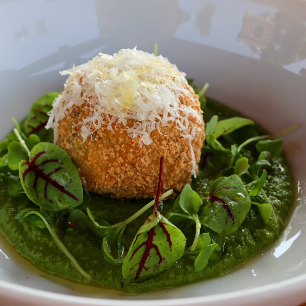 This Fresh Pea Arancini recipe, created by Ste. Anne’s Chef Lucas, features crispy, golden risotto balls with a gooey cheese center set atop a vibrant pea, arugula and basil puree. Topped with parmesan and a drizzle of olive oil, it’s an easy-to-make dish sure to impress.