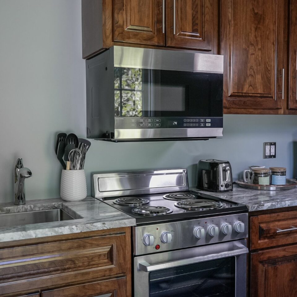 • Kitchenette equipped with fridge, dual microwave/convection oven, coffee maker, tea kettle, coffee, tea, glassware, dishes, pots and pans