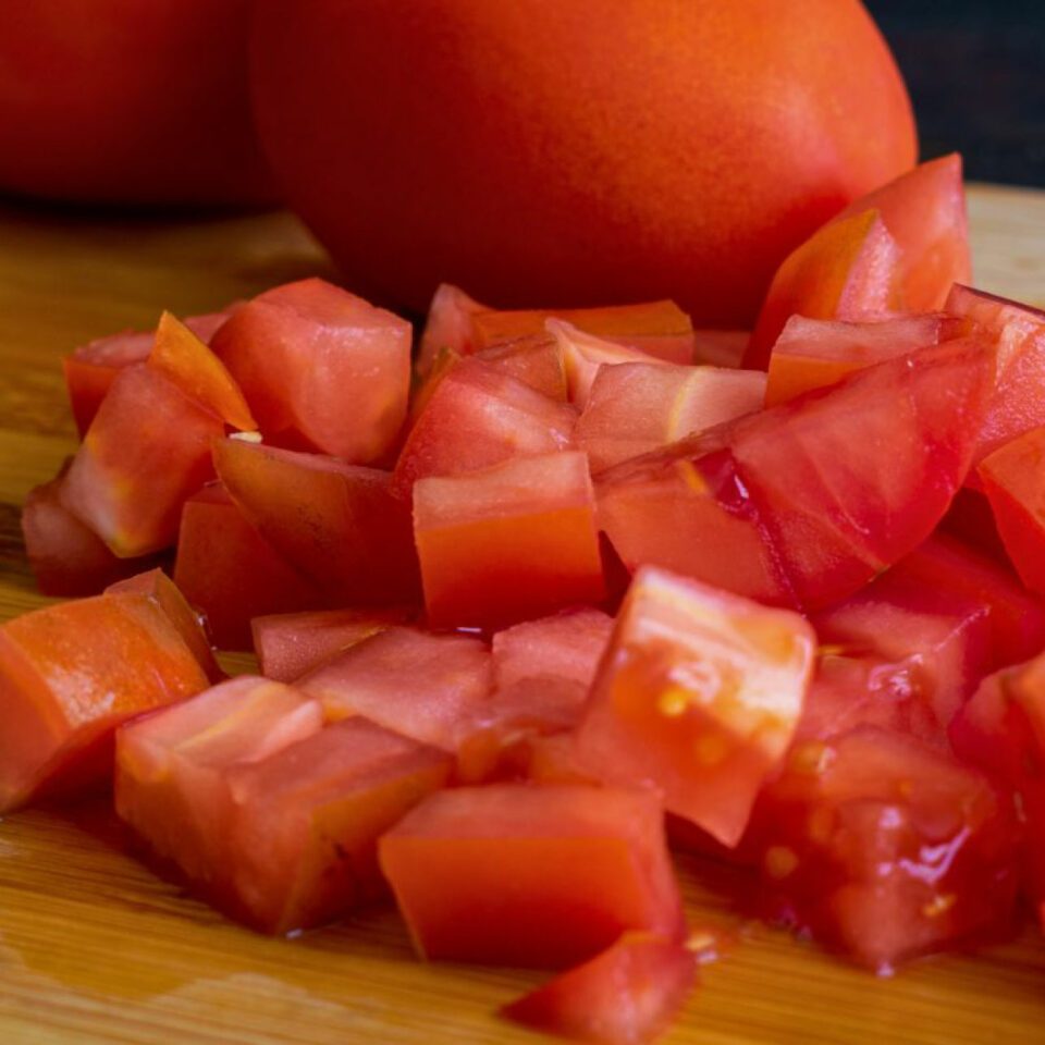Medium dice tomatoes and add to pot on stove over low-medium heat.